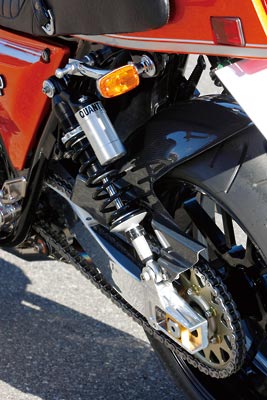 オーナーは愛知県在住ですが最高の車両を求めてはるばる栃木県まで来ていただきました。綿密な打ち合わせのうえ、ベース車探しからフルカスタムまでのフルオーダーとなりました。エンジンはフルオーバーホールされ、ウェブST-1ハイカムとワイセコのピストンを組み込み1105ccまで排気量を拡大。乗り易さを重視し、ノーマルエンジンのような感覚で扱えるセッティングほどこした。マッコイのアウトボードキットをドライブスプロケット側に装着しているが、これはオフセットスプロケットを使用した場合、もっとも力のかかる部分がノーマルより外に出てしますため、外側に受けを設けてシャフトやベアリングへの負担を軽減するためである。